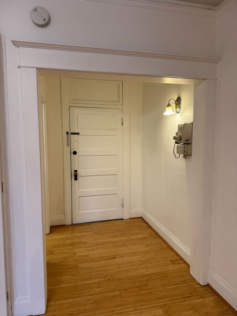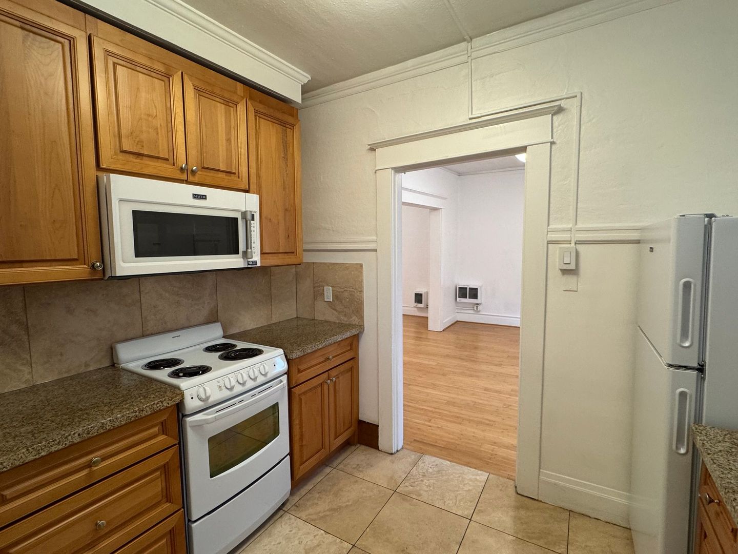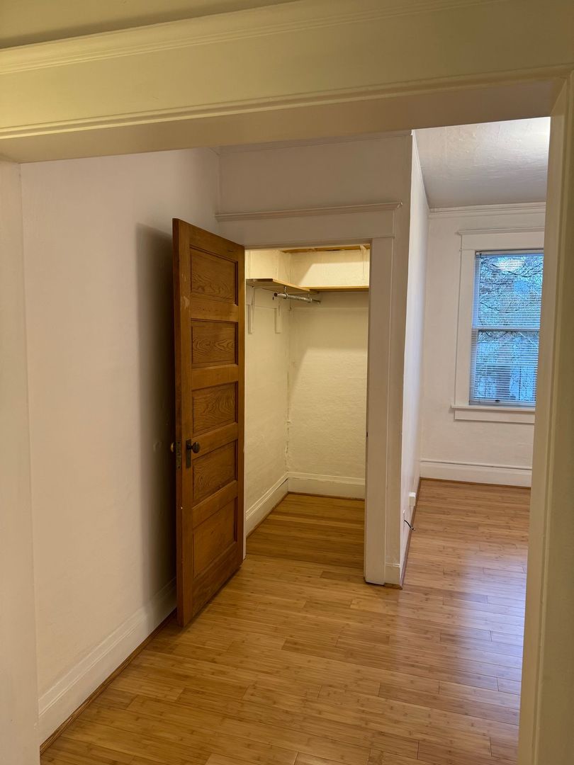 This third-floor corner apartment boasts hardwood floors throughout, offering a classic and durable foundation for the living space. It features essential appliances such as a fridge and stove, ensuring convenience for daily living. Additionally, the apartment includes a desirable walk-in closet, providing ample storage space for residents' belongings.